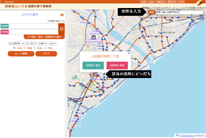 ”住所で探す”のウィンドウ内に、任意の住所(箱根エリア内のみ)を入力します。地図の表示域が指定した位置を中心に移動し、指定した住所にピン