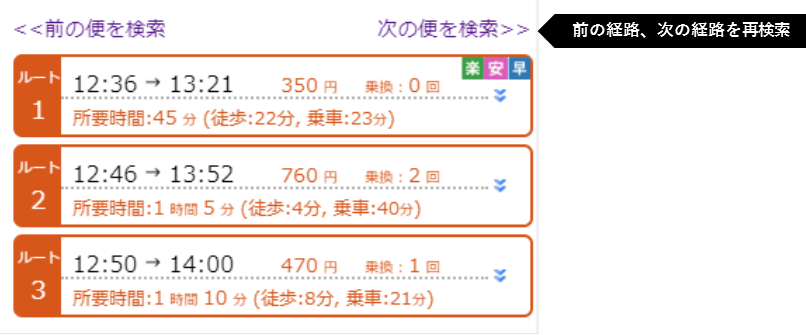 検索結果に対し、設定時刻を基準に、前の経路、後の経路の再検索ができます